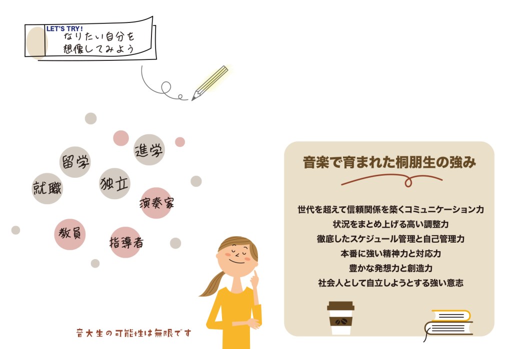 就職活動の支援にとどまらず、進学や留学、演奏家としての独立など、音楽大学ならではの多様な進路に対応しています。一人ひとりの状況や希望に寄り添いながら、共に考え、必要な情報や機会を提供します。